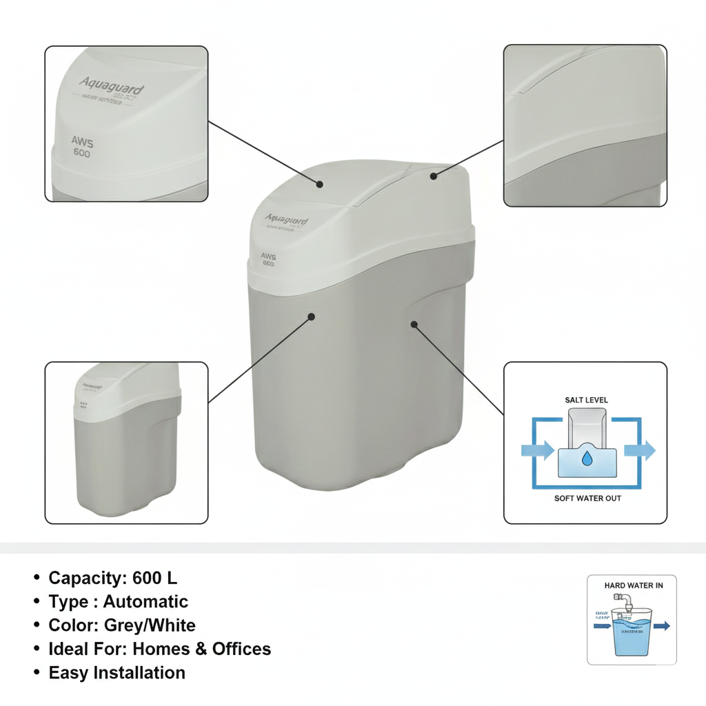 By softening incoming water, the AWS 600 helps extend the life of geysers, washing machines, pipelines, and fittings while improving overall water quality for daily use. It is ideal for areas with high TDS and hard water supply, offering consistent performance with minimal maintenance.