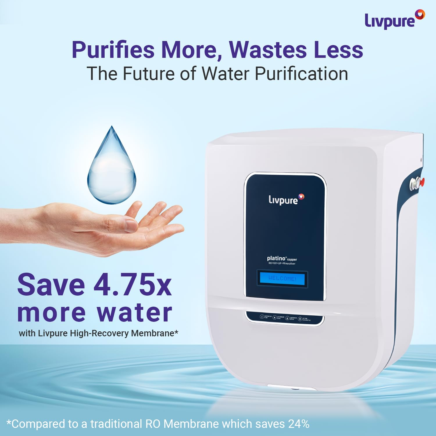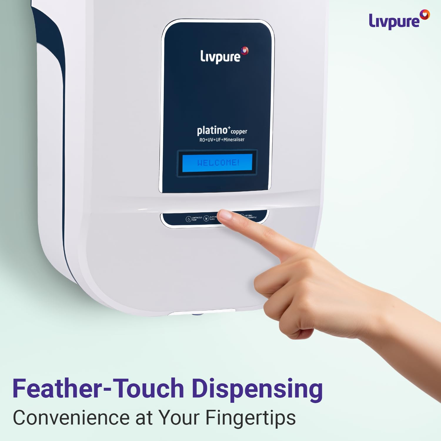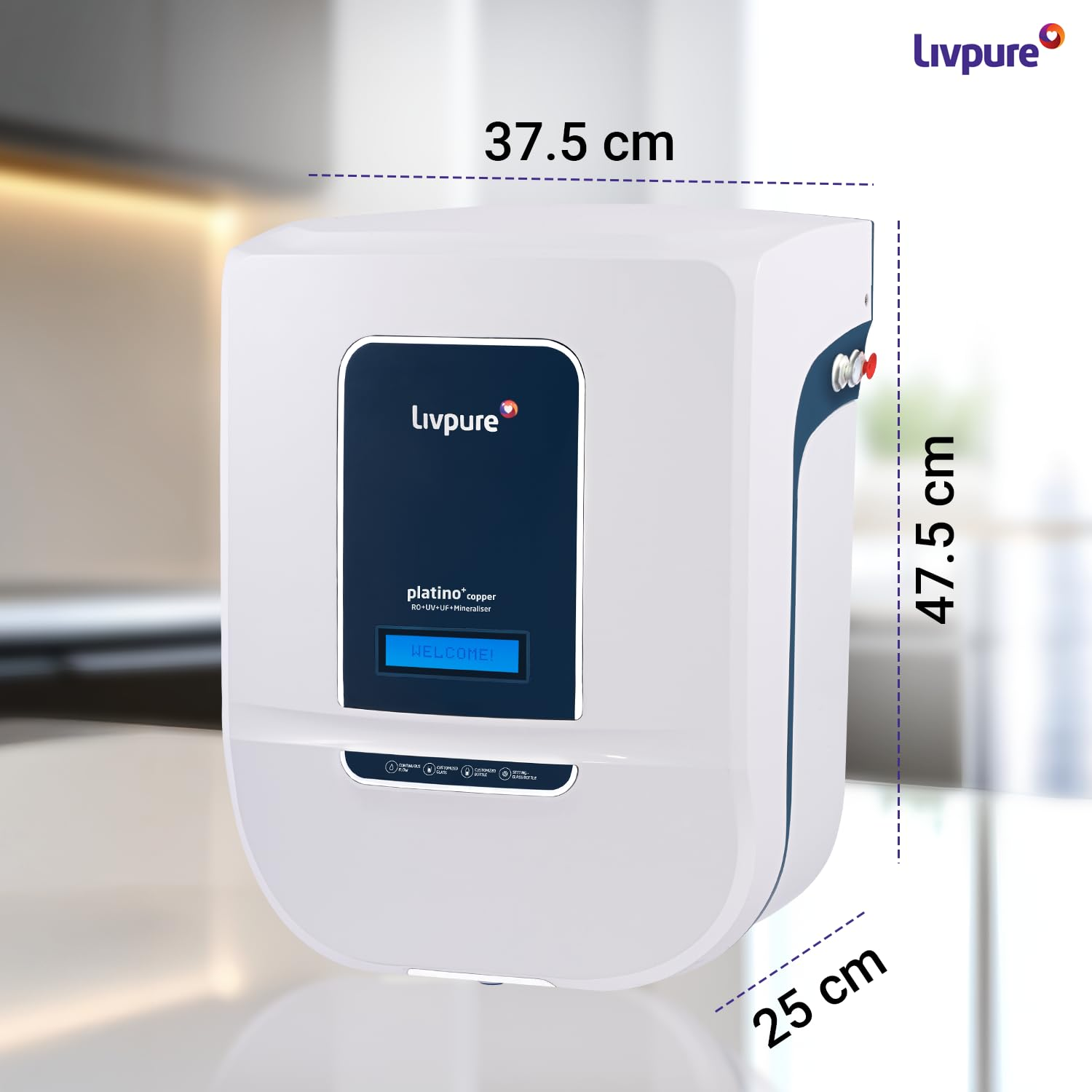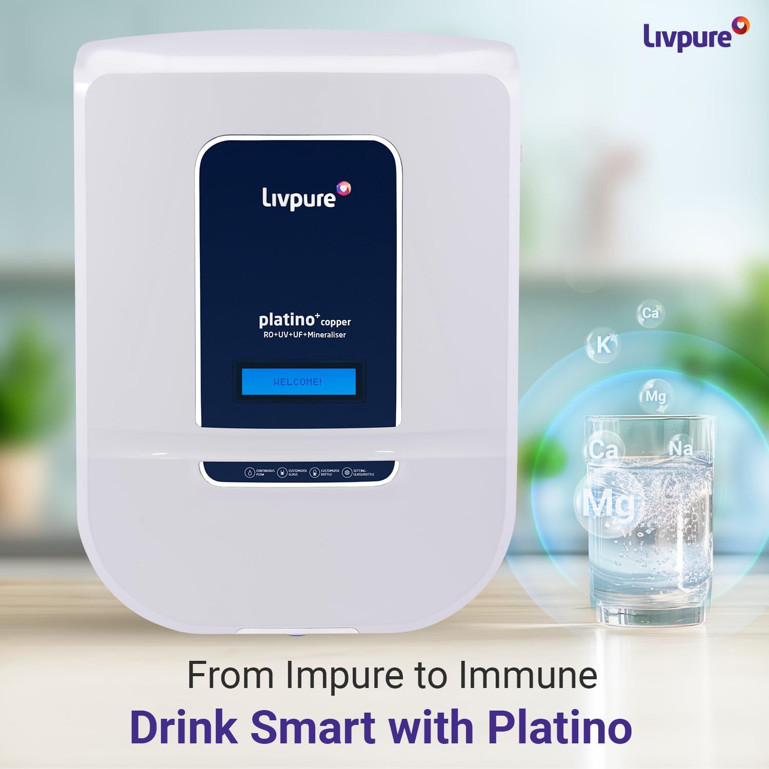 The Livpure Platino Plus Copper RO + UV + UF + Mineraliser Water Purifier is a premium home water purification system designed to deliver safe, healthy, and great-tasting drinking water. Equipped with advanced multi-stage purification and copper enrichment technology, this purifier not only removes harmful impurities but also enhances water quality with essential minerals.